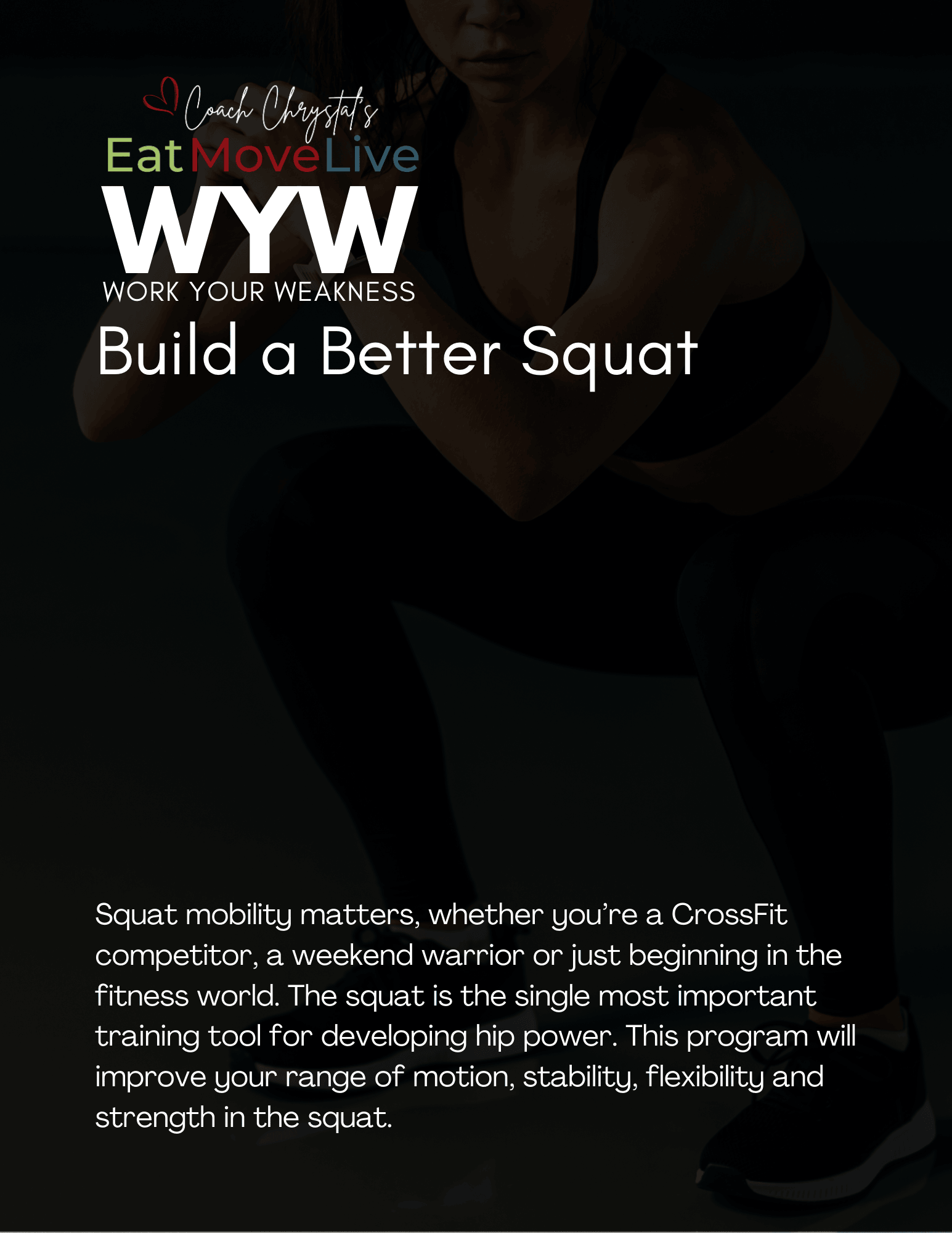 Build a Better Squat is a 4-week, step-by-step program that blends mobility drills, positional strength, and patterning work so you can hit depth with control, keep your chest up, and drive out of the hole with confidence. Every session is laid out for you, including what to do, how long to rest, and how to progress—so you get better reps, better positions, and better carryover to your lifts and WODs.